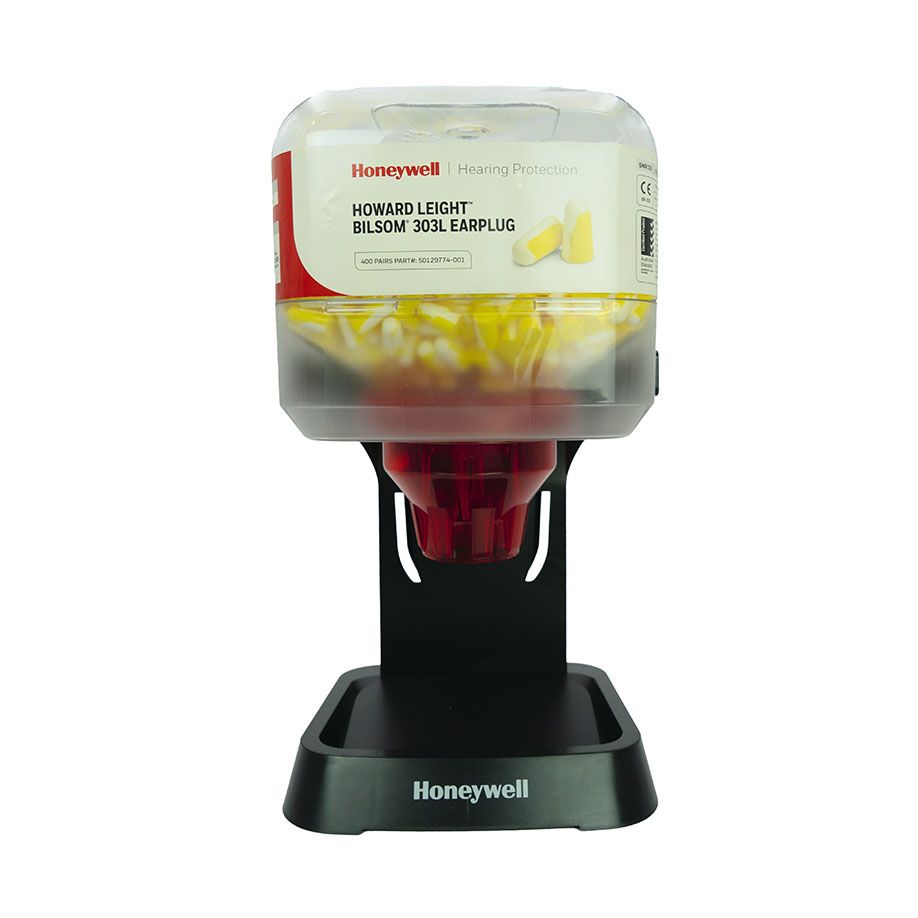 Gefüllter Kunststoffspender mit 400 Paar Bilsom® 303 Gehörschutzstöpsel (SNR 33dB), lose geschüttet. Mit Wandhalterung und Tischfuß, schwarz und Auffangschale. Geeignet für Nachfüllpackungen / Refills.