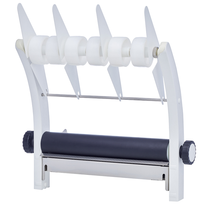 Die MELAfol® - Rollen hängen platzsparend oberhalb des Siegelgerätes. Der Rollenhalter Deluxe ist zusätzlich mit einer Vorschubeinrichtung versehen, die mit einem Handrad das Vorschieben der MELAfol® - Rollen sehr angenehm und komfortabel macht. Außerdem ist das Zuführen und das Vorschieben einer Folie wesentlich einfacher. Geeignet für MEALseal® 100+/200.