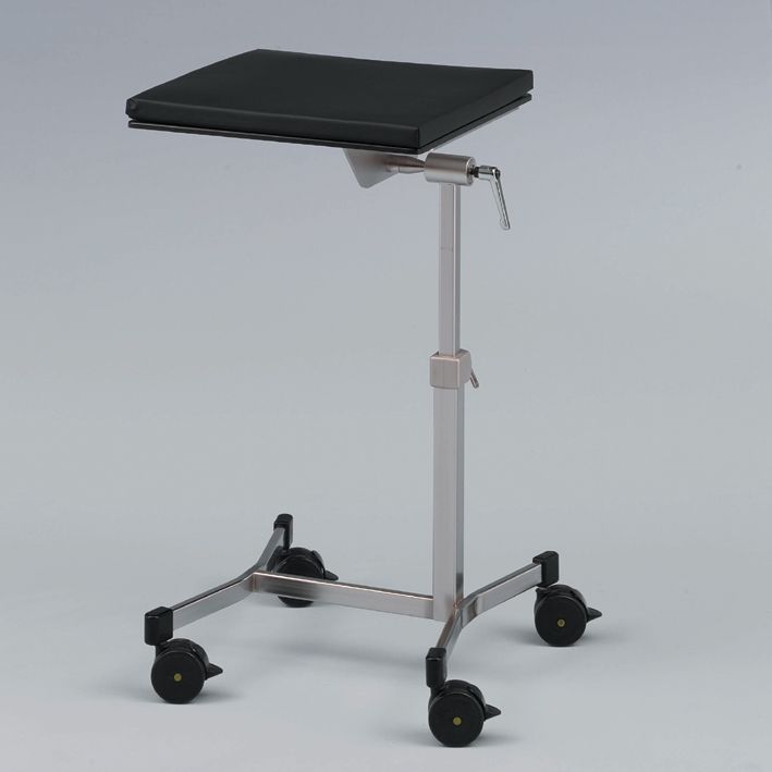 Fahr- und feststellbare Ausführung aus Chromnickelstahl 18/10, Tischplatte röntgenstrahldurchlässig, über Kugelgelenk nach allen Seiten neigbar, fest fixierbar mittels Klemmhebel. Manuell höhenverstellbar von 650 bis 950 mm. 4 Lenkrollen, abriebfest, nicht kontaktfärbend, elektrisch leitend, Ø 75 mm, Gleitlager, vier Rollen feststellbar, sichere Arbeitslast: 40 kg
