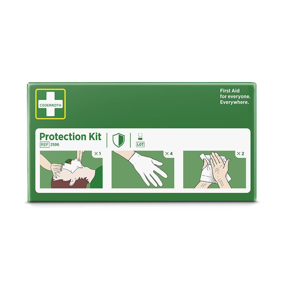 Das Cederroth Schutzpaket ist ein Helfer-Schutz-Kit mit Beatmungsmaske mit Rückschlagventil, 4 x Handschuhe und 2 x Cederroth Safety Hand Cleanser Tücher (70% Alkohol). Die Beatmungsmaske ist ein Hilfsmittel für die korrekte Mund-zu-Mund-Beatmung. Gleichzeitig verringert sie das Risiko bei Kontakt von Helfer und Verletzten.