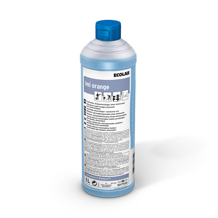 Imi orange ist ein kraftvoller Allzweckreiniger für eine materialschonende Unterhaltsreinigung,der auch bei hartnäckigen Verschmutzungen optimale Reinigungsergebnisse erzielt. Er löst problemlos groben und fetthaltigen Schmutz von Oberflächen und Bodenbelägen und hinterlässt eine langanhaltende Orangenfrische. Auch zur Entfernung von Gummiabrieb und Verstrichungen.