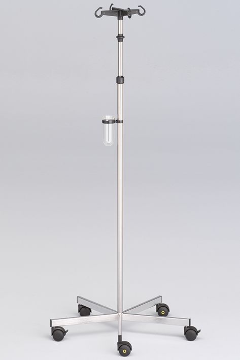 Gestell aus Chromnickelstahl 18/10, zerlegt, 5-Fußkreuz, Oberteil mit 4 Haken, Tropffangglas, Kunststoffdoppelrollen Ø 50 mm, elektrisch leitend, rostfrei, Einhandhöhenverstellung von 1300 bis 2120 mm. Sichere Arbeitslast: pro Haken 2 kg