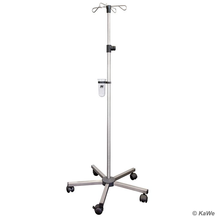 aus hochwertigem Edelstahl, 5-Fuß-Stativ für sicheren Stand, mit stabilem Kunststoffkreuz, Sicherheitshaken (Belastung pro Aufhängehaken max. 2 kg) für Infusionsflaschen inkl. Tropfglas aus Kunststoff, stufenlos höhenverstellbar bis ca. 210 cm, geräuscharme Doppellaufrollen Ø 50 mm mit 2 Bremsrollen, 2 Sicherheitsrollen und 1 antistatische Rolle, inkl. Montageschlüssel, einzeln verpackt, minimale Höhe: 120 cm, maximale Höhe: 210 cm, Ø Standfuß: 60 cm, Gewicht: ca. 3,3 kg