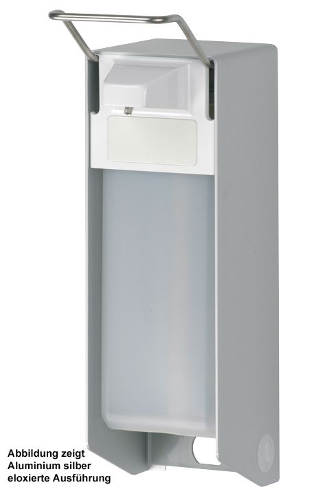 Spender für Flüssigseifen und Desinfektionsmittel, eloxiertes Aluminium, mattsilber, austauschbare 25er Edelstahlpumpe mit geradem Saugrohr, einstellbare Dosierung (ca. 0,7/ 1,0/ 1,5 ml / Hub), spülmaschinengeeignet (60° C), autoklavierbar (121° C), mit kurzem Bedienhebel für Handballenbetätigung, inkl. 1 Clip und HDPE-Leerflasche, Abmessungen (B x H x T): 94 x 317 x 162 mm