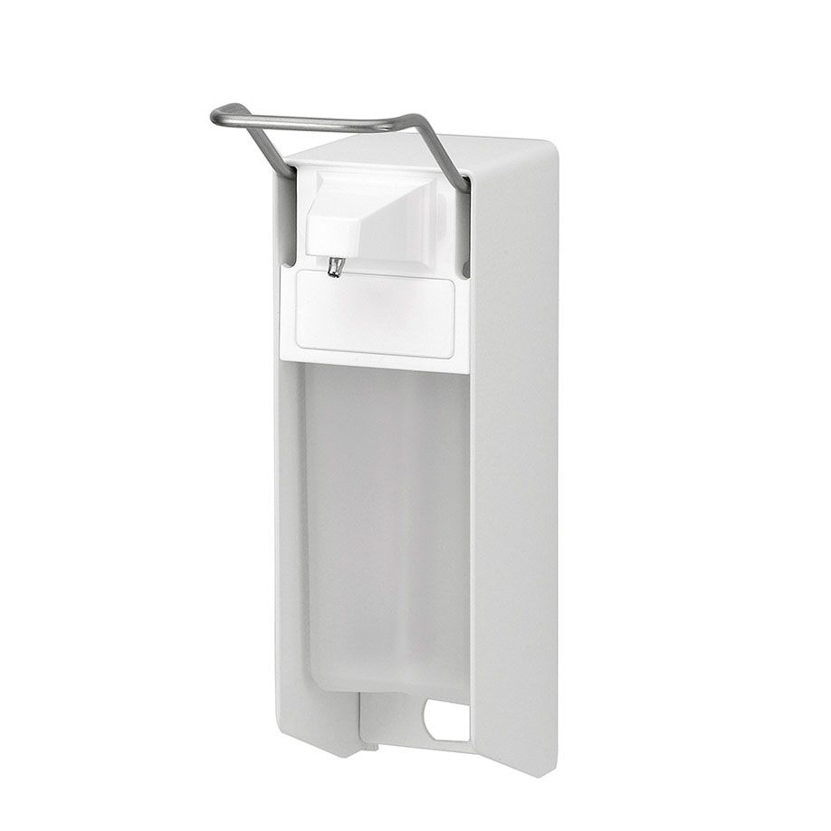 Spender für Flüssigseifen und Desinfektionsmittel, Aluminium, weiß pulverbeschichtet (RAL 9010), austauschbare 25er Edelstahlpumpe mit geradem Saugrohr, einstellbare Dosierung (ca. 0,7/ 1,0/ 1,5 ml / Hub), spülmaschinengeeignet (60° C), autoklavierbar (121° C), mit kurzem Bedienhebel für Handballenbetätigung, inkl. 1 Clip und HDPE-Leerflasche, Abmessungen (B x H x T): 82 x 273 x 162 mm
