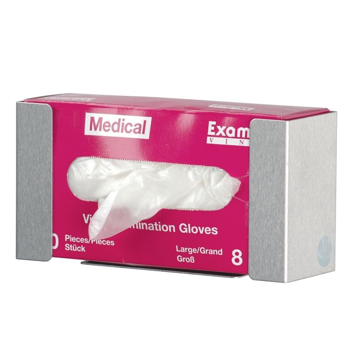 Edelstahlhalterung für 1 Box mit Hygienehanschuhen o.ä., für alle gängigen Verpackungsgrößen, Abmessungen (B x H x T): 255 x 132 x 85 mm, mit Dübeln und Edelstahlschrauben für Wandmontage, Handschuhbox nicht im Lieferumfang enthalten