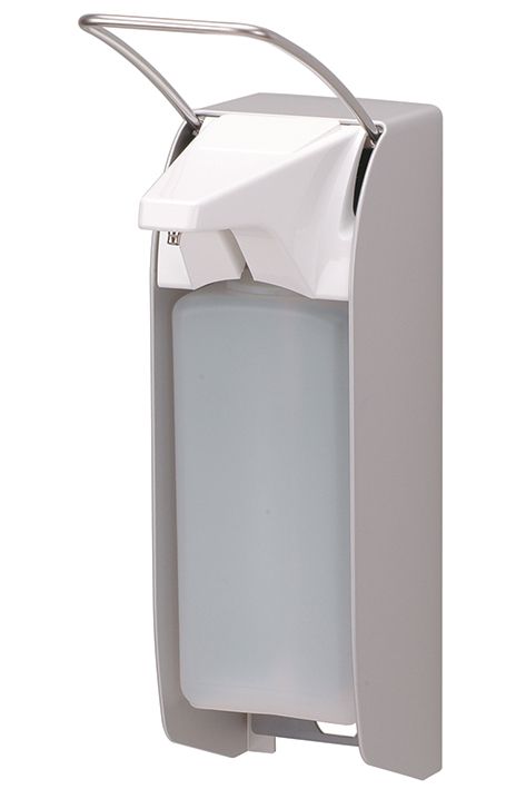 Spender für Flüssigseife und Desinfektionsmittel, austauschbare 24er Edelstahlpumpe mit gekröpftem Saugrohr, einstellbare Dosierung (ca. 0,75/ 1,0/ 1,2/ 1,5 ml / Hub), autoklavierbar (134°C), spülmaschinengeeignet (60° C), für 1000 ml Standard-Euroflaschen (auch frei befüllbar), mit kurzem Bedienhebel für Handballenbetätigung, inkl. 1 Clip, Wandhalter inkl. Montagesatz und HDPE-Leerflasche, Abmessungen (B x H x T): 94 x 341 x 170 mm.