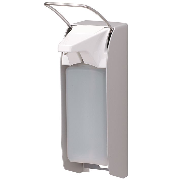 Spender für Flüssigseife und Desinfektionsmittel, austauschbare 25er Edelstahlpumpe mit geradem Saugrohr, einstellbare Dosierung (ca. 0,75/ 1,0/ 1,2/ 1,5 ml), autoklavierbar (134°C), spülmaschinengeeignet (60° C), für 1000 ml Standard-Euroflaschen (auch frei befüllbar), mit kurzem Bedienhebel für Handballenbetätigung, inkl. 1 Clip, Wandhalter inkl. Montagesatz und HDPE-Leerflasche, Abmessungen (B x H x T): 94 x 341 x 170 mm.