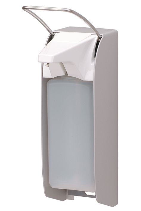 Spender für Flüssigseife und Desinfektionsmittel, austauschbare Kunststoffpumpe mit geradem Saugrohr, einstellbare Dosierung (ca. 0,7/ 1,0/ 1,5 ml/Hub), Spender spülmaschinengeeignet (60° C), autoklavierbar bis 134° C, Pumpe spülmaschinengeeignet,, für 1000 ml Standard-Euroflaschen (auch frei befüllbar), mit kurzem Bedienhebel für Handballenbetätigung, inkl. 1 Clip, Wandhalter inkl. Montagesatz und HDPE-Leerflasche, Abmessungen (B x H x T): 94 x 341 x 170 mm.