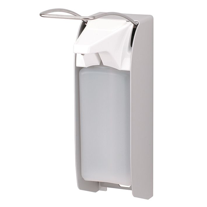 Spender für Flüssigseife und Desinfektionsmittel, austauschbare 25er Edelstahlpumpe mit geradem Saugrohr, einstellbare Dosierung (ca. 0,75/ 1,0/ 1,2/ 1,5 ml), autoklavierbar (134°C), spülmaschinengeeignet (60° C), für 1000 ml Standard-Euroflaschen (auch frei befüllbar), mit langem Bedienhebel für Ellbogenbetätigung, inkl. 1 Clip, Wandhalter inkl. Montagesatz und HDPE-Leerflasche, Abmessungen (B x H x T): 94 x 321 x 230 mm.