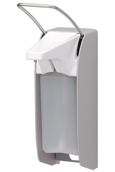 Spender für Flüssigseife und Desinfektionsmittel, 24er Edelstahlpumpe mit gekröpftem Saugrohr, einstellbare Dosierung (ca. 0,75/ 1,0/ 1,2/ 1,5 ml / Hub), autoklavierbar (134°C), spülmaschinengeeignet (60° C), für 500 ml Standard-Euroflaschen (auch frei befüllbar), mit kurzem Bedienhebel für Handballenbetätigung, inkl. 1 Clip, Wandhalter inkl. Montagesatz und HDPE-Leerflasche, Abmessungen (B x H x T): 82 x 305 x 169 mm.