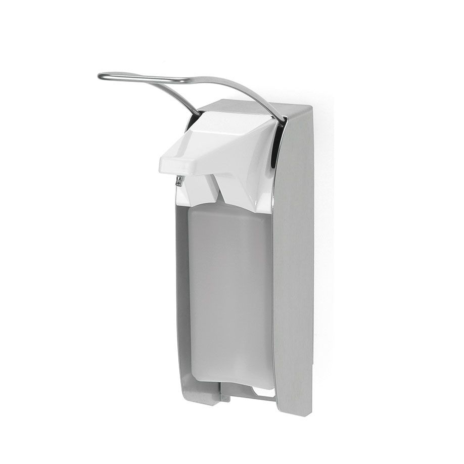 Spender für Flüssigseife und Desinfektionsmittel, austauschbare Kunststoffpumpe mit geradem Saugrohr, einstellbare Dosierung (ca. 0,7/ 1,0/ 1,5 ml/Hub), Spender spülmaschinengeeignet (60° C), autoklavierbar bis 134° C, Pumpe spülmaschinengeeignet, für 500 ml Standard-Euroflaschen (auch frei befüllbar), mit langem Bedienhebel für Ellbogenbetätigung, inkl. 1 Clip, Wandhalter inkl. Montagesatz und HDPE-Leerflasche, Abmessungen (B x H x T): 82 x 287 x 223 mm