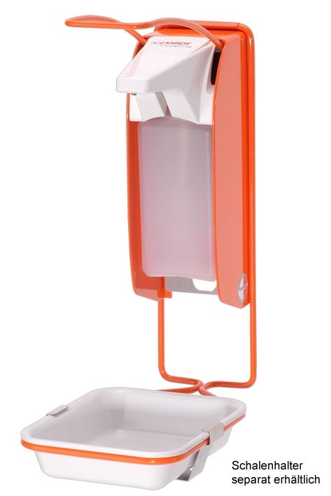 Spender für Flüssigseife und Desinfektionsmittel, austauschbare 24er Edelstahlpumpe mit gekröpftem Saugrohr, einstellbare Dosierung (ca. 0,75/ 1,0/ 1,2/ 1,5 ml), Spender spülmaschinengeeignet (60° C); Pumpe spülmaschinengeeignet und autoklavierbar bis 134° C, für 500 ml Standard-Euroflaschen (auch frei befüllbar), mit langem Bedienhebel für Ellbogenbetätigung, inkl. 1 Clip, Wandhalter inkl. Montagesatz und HDPE-Leerflasche, Abmessungen (B x H x T): 82 x 287 x 223 mm.