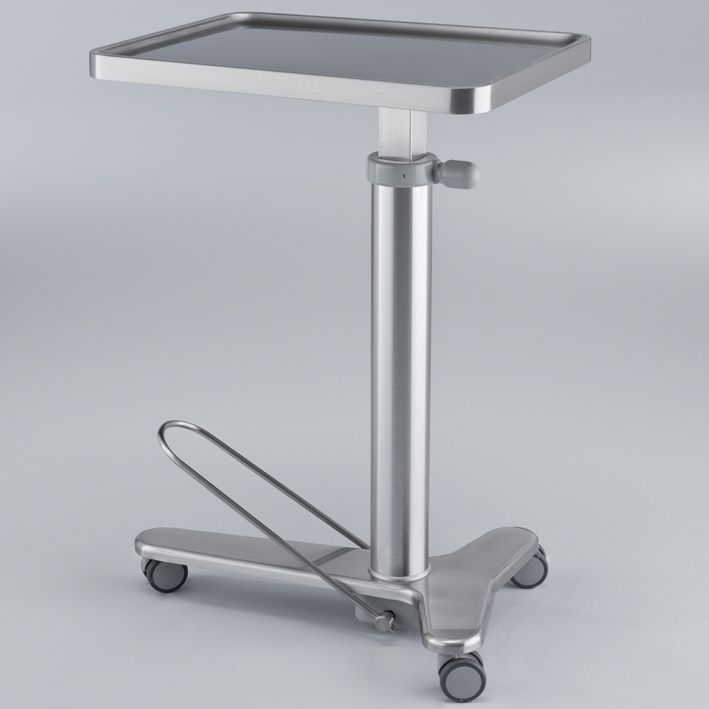 Mit Fußpumpe, Höhenverstellung durch Trittbügel von 950 bis 1350 mm, nahtlos tiefgezogene Tischplatte aus Chromnickelstahl 18/10, 700 x 500 mm mit 15 mm hohem Rand, abnehmbar, 360° drehbar und in jeder Position fixierbar, Kanten und Ecken abgerundet, Standrohr und Tragrahmen aus Chromnickelstahl 18/10, Fußgestell mit Chromnickelstahlverkleidung, geschlossenen Kunststoffdoppelrollen Ø 75 mm, kugelgelagert, elektrisch leitend, rostfrei. Sichere Arbeitslast in jeder Position der Tischplatte: 30 kg