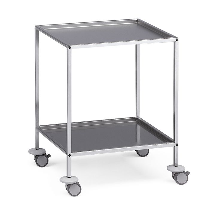 Gestell aus Chromnickelstahl 18/10, Rohrrahmen als Schutzgalerie ausgebildet, Tischplatten 600 x 450 mm aus Chromnickelstahl, herausnehmbar, Tischhöhe 800 mm, Kunststoffdoppelrollen Ø 75 mm, elektrisch leitend, rostfrei, abriebfest, kontaktverfärbungsfrei, Fadenschutz, 2 Rollen mit Feststeller, 4 Wandabweisrollen, ohne Schublade. Sichere Arbeitslast pro Tischplatte: 50 kg.