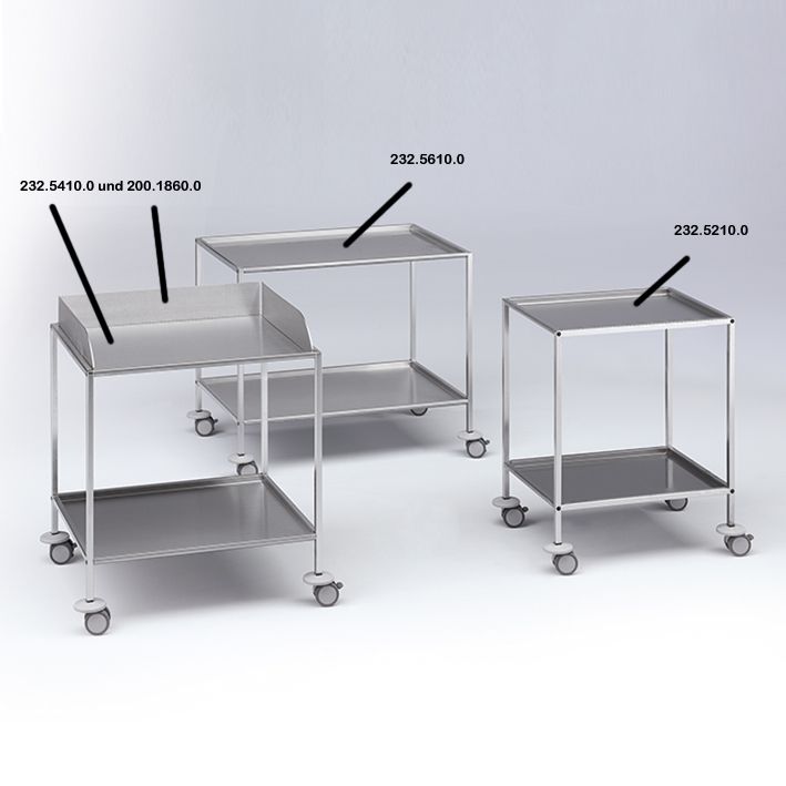 Gestell aus Chromnickelstahl 18/10, Rohrrahmen als Schutzgalerie ausgebildet, Tischplatten 900 x 600 mm aus Chromnickelstahl 18/10, herausnehmbar, Tischhöhe 800 mm, Kunststoffdoppelrollen Ø 75 mm, elektrisch leitend, rostfrei, abriebfest, kontaktverfärbungsfrei, Fadenschutz, 2 Rollen mit Feststeller, 4 Wandabweisrollen. Sichere Arbeitslast pro Tischplatte: 50 kg.