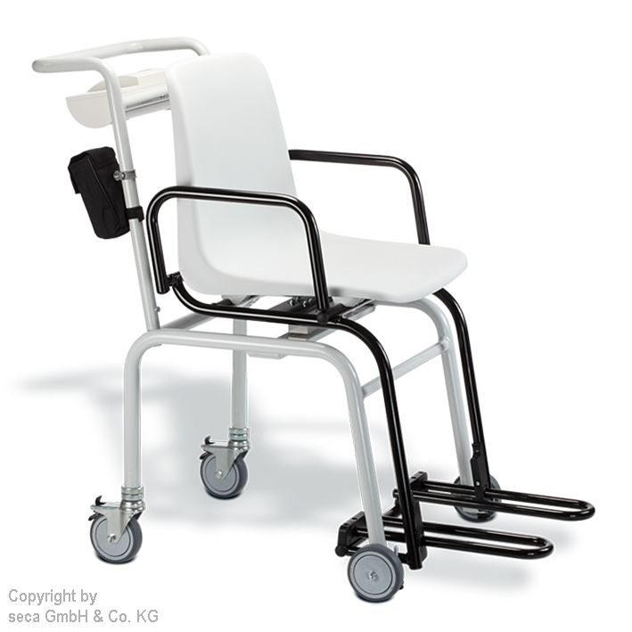 Eine bequeme Sitzschale sorgt für sicheren Halt, die einzeln nach hinten abklappbaren Armlehnen und schwenkbare Fußstützen erhöhen die Bedienungsfreundlichkeit. Mit den hinteren Radfeststellbremsen ist jederzeit ein sicheres Hinsetzen und Aufstehen möglich. Die Positionierung des Anzeigeelementes hinter dem Stuhl erlaubt ein intuitives Arbeiten mit den vielfältigen Funktionen wie TARA, HOLD und BMI. Diese mobile Stuhlwaage, wahlweise über Netz oder Akku betrieben, leistet überall unschätzbare Hilfe: ob in der Reha, der Orthopädie, der Dialyse, im Bereich der Alten- und Pflegebetreuung. Und mit ihrer feinen Teilung von 50 g bis 150 kg ist sie speziell für die Kinder- und Jugendmedizin ausgesprochen wertvoll. So können z. B. Kleinkinder, die noch nicht stehen können, bequem im Sitzen gewogen werden. Praktisch: Die mitgelieferte Tasche seca 471 lagert das Netzteil direkt an der Waage.