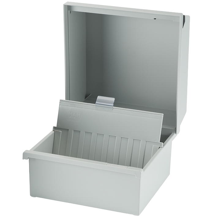 Zur Aufbewahrung von ca. 800 Karten oder Formularen im Format DIN A5 quer, aus schlagfestem und schwermetallfreiem Kunststoff, abnehmbarer gleichfarbiger Deckel, Filzfüße, 1 Stützplatte mit Sichtreiter, ohne Schloß, Maß 235 x 250 x 190 mm (BxTxH).