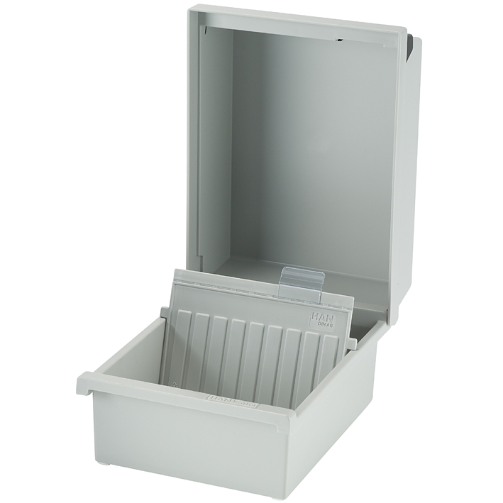 Zur Aufbewahrung von ca. 800 Karten oder Formularen im Format DIN A6 quer, aus schlagfestem und schwermetallfreiem Kunststoff, abnehmbarer gleichfarbiger Deckel, Filzfüße, 1 Stützplatte mit Sichtreiter, ohne Schloß, Maß 176 x 248 x 140 mm (BxTxH).