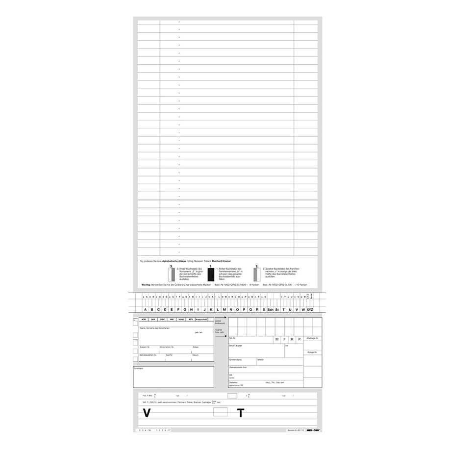 Weiß, 180 g Computerkarton, holzfrei, extra zäh, 4 Quernutungen (1 x oben, 3 x unten), plan verpackt, Adressfeld gemäß eGK, Klebefeld für Abheftstreifen (Artikel-Nr. 60.010), Linierung 8,5 mm. Wird zur Anwendung 2 x gefaltet. Maße aufgeklappt 442 x 210 mm, gefaltet bis 164 x 210 mm.