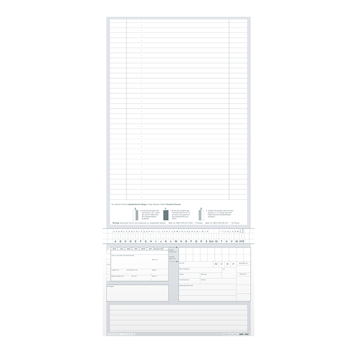 Weiß, 180 g Computerkarton, holzfrei, extra zäh, 4 Quernutungen, 1 x oben, 3 x unten, plan verpackt. Adressfeld gemäß KVK, Klebefeld für Abheftstreifen (Artikel-Nr. 60.010), Linierung 7 mm. Wird zur Anwendung 2 x gefaltet. Maße aufgeklappt 442 x 210 mm, gefaltet bis 164 x 210 mm.