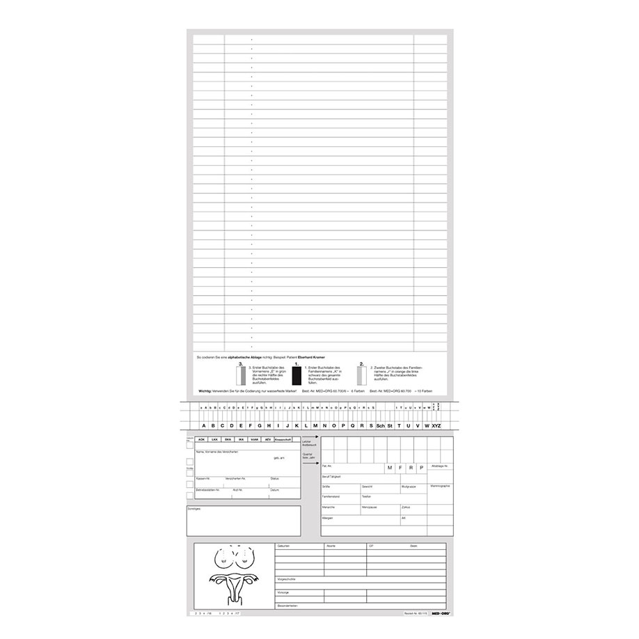 Weiß, 180 g Computerkarton, holzfrei, extra zäh, 4 Quernutungen (1 x oben, 3 x unten), plan verpackt, Adressfeld gemäß eGK, Klebefeld für Abheftstreifen (Artikel-Nr. 60.010), Linierung 7 mm. Wird zur Anwendung 2 x gefaltet. Maße aufgeklappt 442 x 210 mm, gefaltet bis 164 x 210 mm.