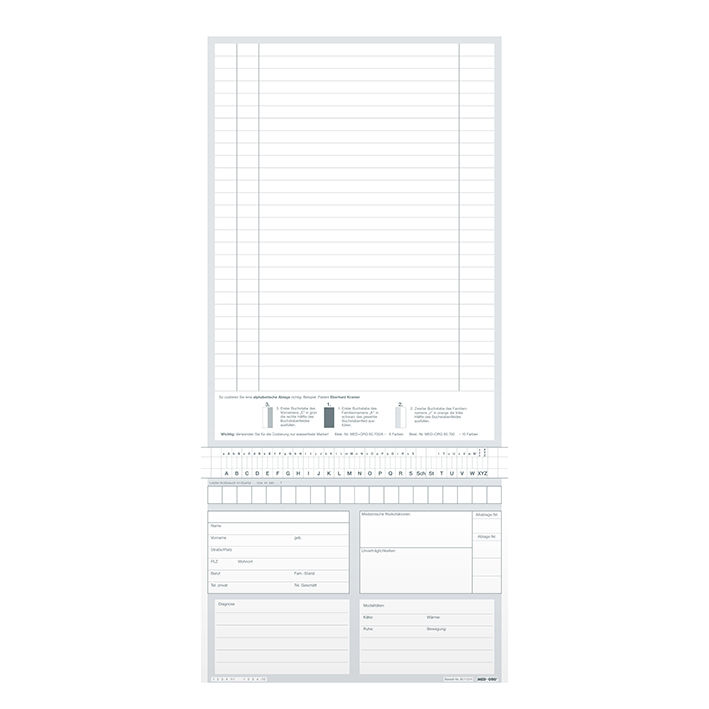 Weiß, 180 g Computerkarton, holzfrei, extra zäh, 4 Quernutungen, 1 x oben, 3 x unten, plan verpackt. Standard-Adressfeld, Klebefeld für Abheftstreifen (Artikel-Nr. 60.010), Linierung 8,5 mm. Wird zur Anwendung 2x gefaltet. Maße aufgeklappt 442 x 210 mm, gefaltet bis 164 x 210 mm.