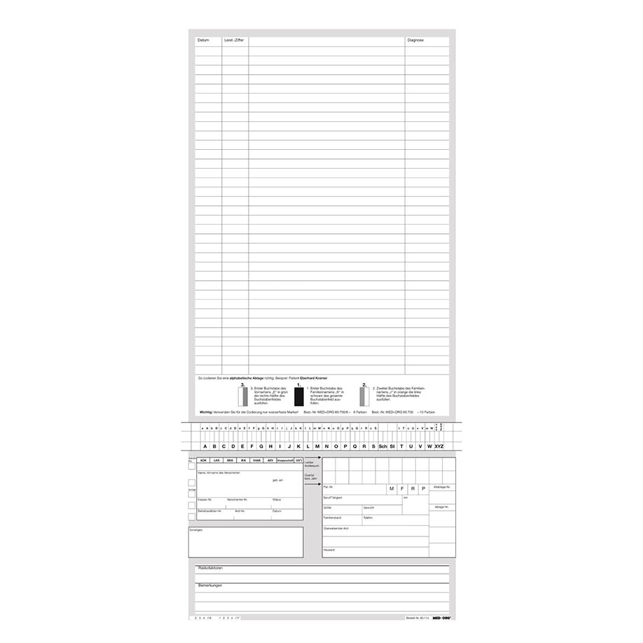 Weiß, 180 g Computerkarton, holzfrei, extra zäh, 4 Quernutungen (1 x oben, 3 x unten), plan verpackt, Adressfeld gemäß eGK, Klebefeld für Abheftstreifen (Artikel-Nr. 60.010), Linierung 7 mm. Wird zur Anwendung 2 x gefaltet. Maße aufgeklappt 442 x 210 mm, gefaltet bis 164 x 210 mm.