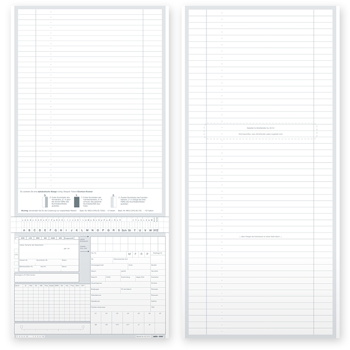 Weiß, 180 g Computerkarton, holzfrei, extra zäh, 4 Quernutungen, 1 x oben, 3 x unten, plan verpackt. Adressfeld gemäß KVK, Klebefeld für Abheftstreifen (Artikel-Nr. 60.010), Linierung 7 mm. Wird zur Anwendung 2 x gefaltet. Maße aufgeklappt 442 x 210 mm, gefaltet bis 164 x 210 mm.