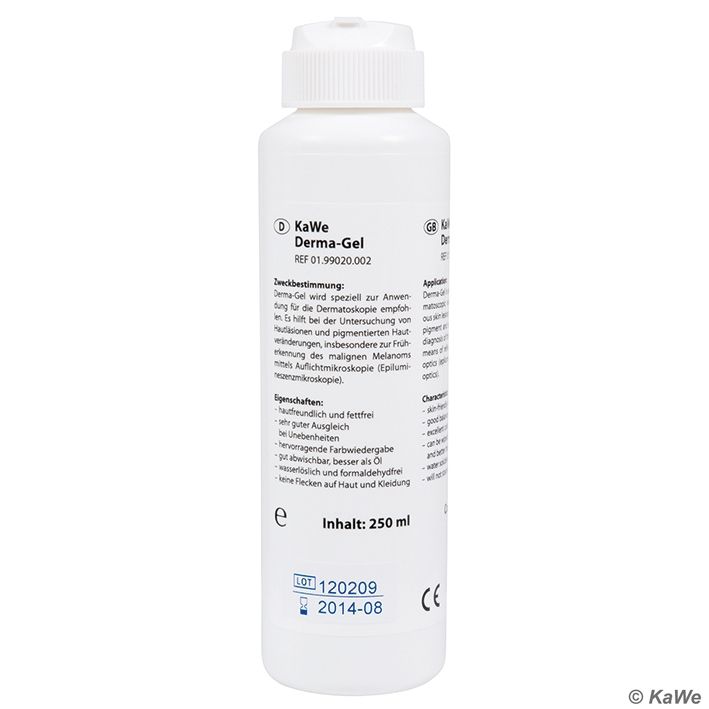 Durch Benetzen mit dem speziellen Dermatoskop-Gel, werden Hautreflexe vermieden und das störende Hautrelief unsichtbar gemacht, so dass nur noch die reine Hautverfärbung erkennbar ist. Weitere Eigenschaften: hautfreundlich und fettfrei, sehr guter Ausgleich bei Unebenheiten, hervorragende Farbwiedergabe, gut abwischbar, besser als Öl, wasserlöslich und formaldehydfrei, keine Flecken auf Haut und Kleidung.