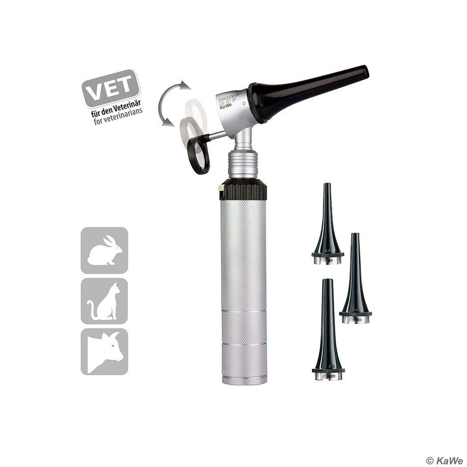 für den Veterinär, Otoskop-Kopf oben zugänglich für Instrumentarium, speziell für den OP-Bereich, Vakuum-Lampe, Leuchtmittel KUW 12.75111.013, 2-fache Lupenvergrößerung mit spezieller Brennweite, Metall-Batterie-Ladegriff C, Rheostat dimmbar 3 VET-Dauer-Ohrtrichter Ø 4,0 / 5,0 / 7,0 mm, in Reißverschlusstasche, Batterien: 2 Baby (Typ C) (Batterien nicht im Lieferumfang enthalten)