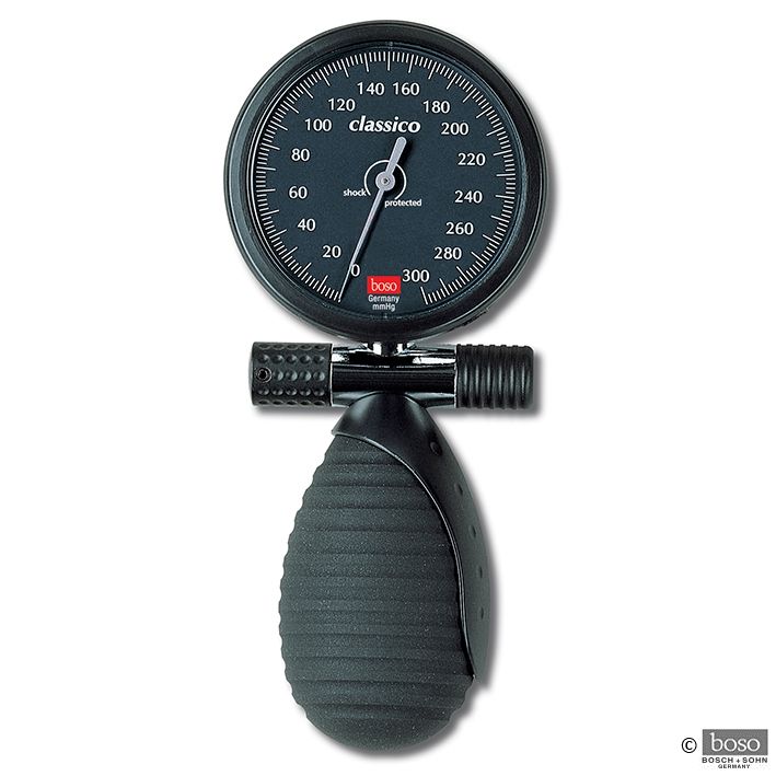 Hochwertig in Chrom mit mattschwarzen Elementen mit der 2-in-1-Schlauch-Technik: alle Vorteile der Zweischlauch-Technik mit nur einem sichtbaren Schlauch. Wie alle boso Manometer ist dieses Gerät überdrucksicher und mit einem korrosionsfreien Präzisionsmesswerk ausgerüstet. Keine Schäden, keine Reklamationen, keine Reparaturkosten - perfekte Sicherheit in jedem Fall, auch für den harten Einsatz in der Praxis und Klinik, Schraubanschluss für Manschette.