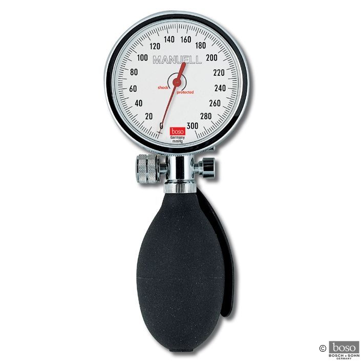 Dieser Klassiker der Doppelschlauch-Technik ist mit einer Ø 60 mm Skala erhältlich. Wie alle boso Manometer ist dieses Gerät überdrucksicher und mit einem korrosionsfreien Präzisionsmesswerk ausgerüstet. Keine Schäden, keine Reklamationen, keine Reparaturkosten - perfekte Sicherheit in jedem Fall, auch für den harten Einsatz in der Praxis und Klinik. Schraubanschluss für Manschette.