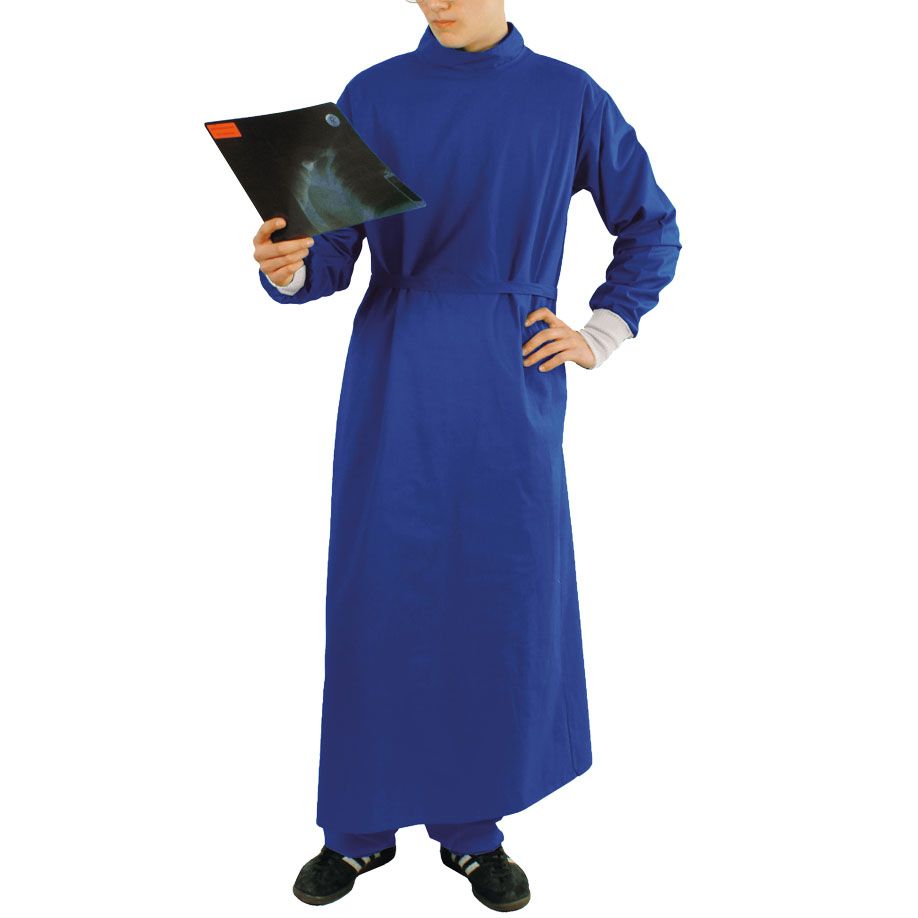 mit elastischen Ärmelstrickbündchen, mit angenähtem Bindegürtel, hinten zu knöpfen, Länge ca. 140 cm, wasserdurchlässig, nicht keimdicht, 100 % Baumwolle (TB 21), waschbar bis 95°C, Chlorbleiche nicht möglich, chem. Reinigung möglich, autoklavierbar (niedrigste Stufe, nicht für Heißluftsterilisation geeignet), trocknen im Wäschetrockner bei mittleren Temperaturen
