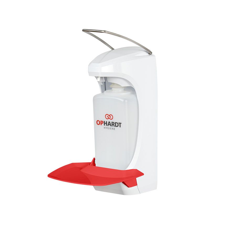 Für Desinfektionsmittel, Alcogel, Seifen und fließfähige Lotionen, geeignet für 1000 ml-Euroflaschen, Kunststoff-Gehäuse weiß, Bedienhebel aus Edelstahl, für Wandmontage, austauschbare Kunststoffpumpe, einstellbare Dosiermenge (ca. 0,8/ 1,1/ 1,5 ml/Hub), inkl. HDPE-Leerflasche, Spender nicht abschließbar