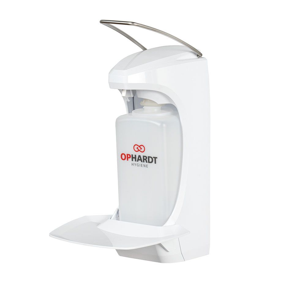 Für Desinfektionsmittel, Alcogel, Seifen und fließfähige Lotionen, geeignet für 1000 ml-Euroflaschen, Kunststoff-Gehäuse weiß, Bedienhebel aus Edelstahl, für Wandmontage, austauschbare Kunststoffpumpe, einstellbare Dosiermenge (ca. 0,8/ 1,1/ 1,5 ml/Hub), inkl. HDPE-Leerflasche, Spender nicht abschließbar