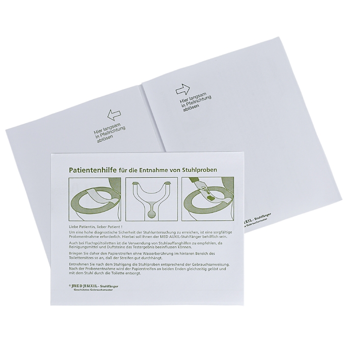 Hygienische Patientenhilfe zur Gewinnung von Stuhlproben, wasserlösliches Spezialpapier aus Primärholzfasern, bis 500 g belastbar, hält bis zu 3 Min. nach Probenabgabe, wird nach Probenentnahme einfach abgespült, keine Verstopfungsgefahr, weiß, bedruckt -Version deutsch.