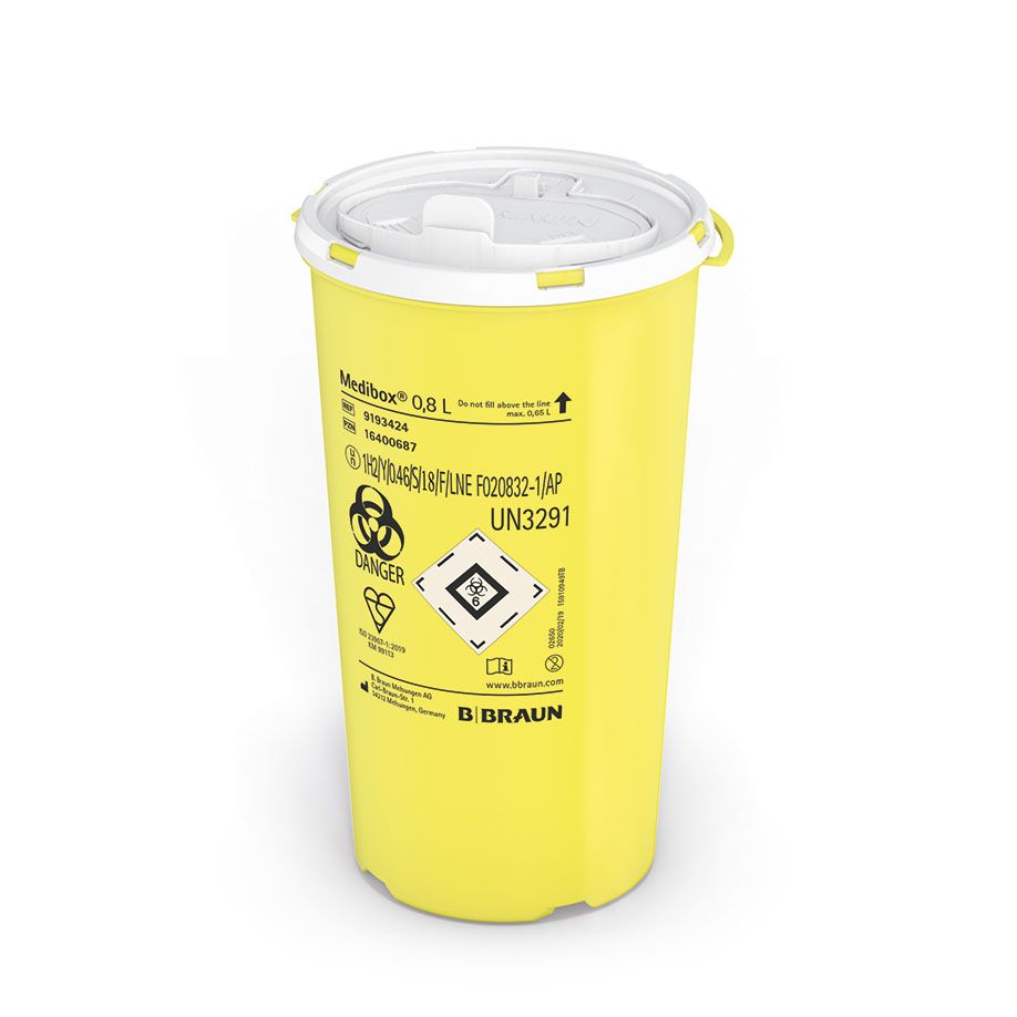 Abfallbehältnis für die Entsorgung spitzer und scharfer medizinischer Instrumente im medizinischen Umfeld.