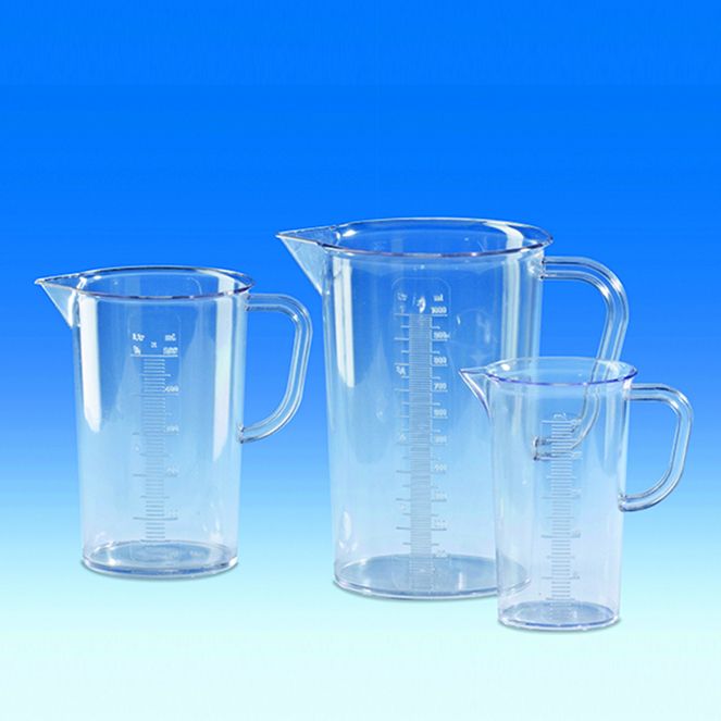 mit stabilem, griffigem Henkel, geschlossener Griff, glasklar, Teilung 10 ml, Höhe 133 mm, Ø 91 mm, nicht sterilisierbar, lebensmittelgeeignetes Produkt entsprechend Verordnung (EU) Nr. 10/2011