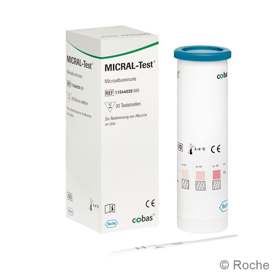 Micral-Test® ist ein visueller Urintest-Streifen zur immunologischen Bestimmung einer Mikroalbuminurie (MAU). Der semiquantitative Test erkennt dabei bereits kleinste Mengen Albumin im Urin (cutoff 20 mg/L). Testergebnis in 1 Minute.