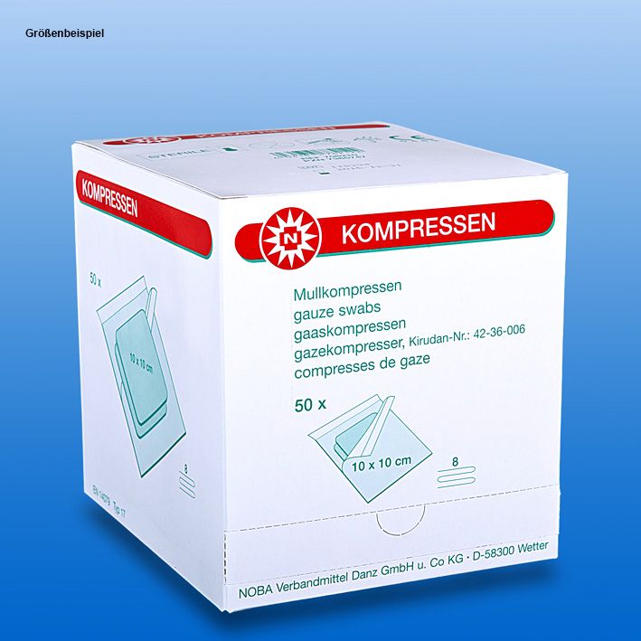 Die Kompressen mit eingeschlagener Schnittkante werden aus Verbandmull hergestellt nach den Vorgaben aus: EN 14079 Typ 17. Die Mullkompressen sind mit den Faltrücken nach oben in den Sterilpackungen verpackt, so dass eine einfache Entnahme möglich ist.