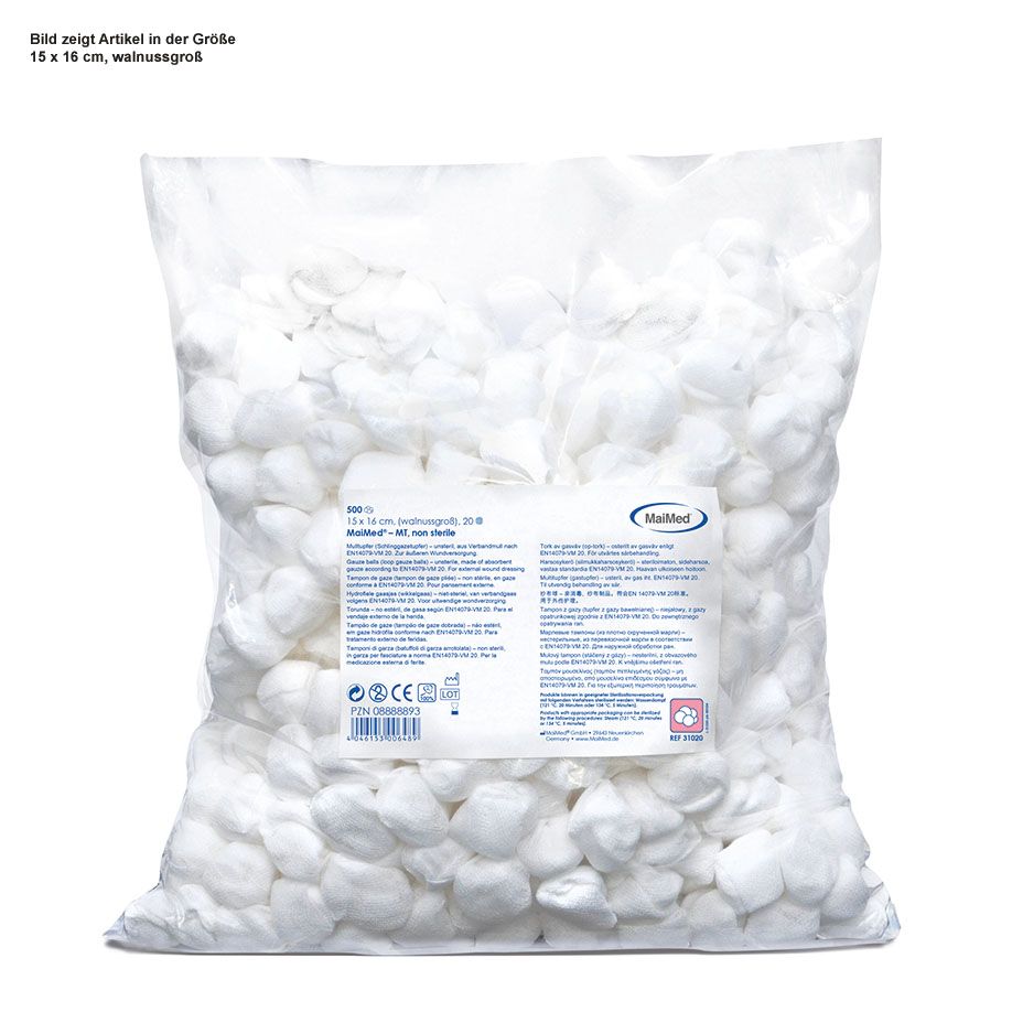 gebrauchsfertige Schlinggazetupfer/Mulltupfer aus einem Mullzuschnitt, aus Verbandmull EN 14079-VM 20, 20-fädig, 100% Baumwolle, zur äußeren Wundversorgung, Wundreinigung, Blutabsorption und Sekretaufnahme, sowie zur Hautdesinfektion, in Ambulanz und auf Station, sterilisierbar, A 121°C oder EO