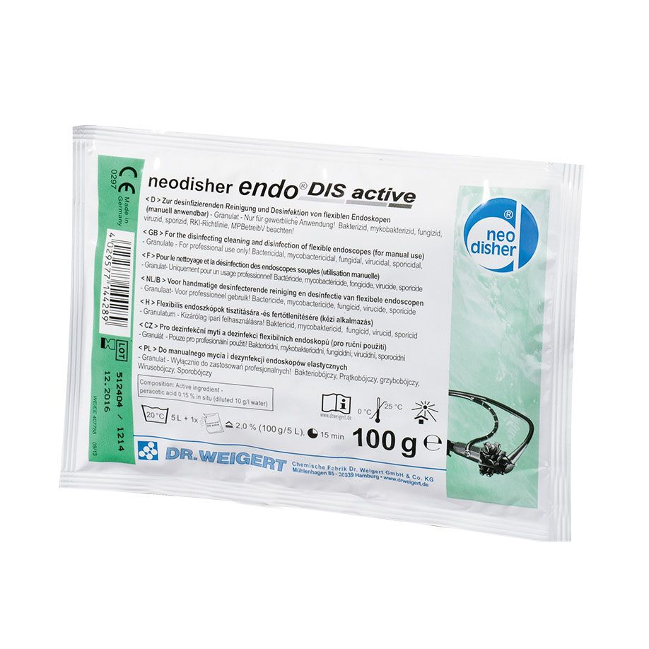 Granulat für die desinfizierende Vorreinigung und für die Desinfektion von flexiblen Endoskopen und endoskopischem Zusatzinstrumentarium im Tauch- oder Ultraschallbad vor der maschinellen Aufbereitung. Bakterizid, mykobakterizid, fungizid, viruzid, sporizid. Gute Reinigungsleistung, nicht proteinfixierend, pH-neutral, gute Löslichkeit, sehr gute Materialverträglichkeit. Für die Endoskope aller führenden Hersteller geeignet. Frei von Formaldehyd und quaternären Ammoniumverbindungen (QAV). Auf Basis von Peressigsäure. VAH-gelistet, in der Viruzidie-Liste des IHO eingetragen.