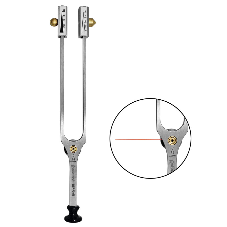 Neurologische Multifunktionsstimmgabel nach Rydel-Seiffer c 128 Hz/C 64 Hz, mit integrierten Stumpf-Spitz-Prüfelementen, Warm-Kalt-Prüfaufsätzen und ausschwenkbarem Monofilament, Länge ca. 23,5 cm. Besonders gut geeignet für Diabetologen zur Untersuchung der Polyneuropathie, einer Nervenerkrankung, die sich in einer Herabsetzung der Vibrationsempfindlichkeit äußert. Die Stimmgabel aus Edelstahl auf Kunststofffuß überzeugt durch lange Schwingungsdauer, hohe Klangreinheit und dauerhafte Tonstabilität.