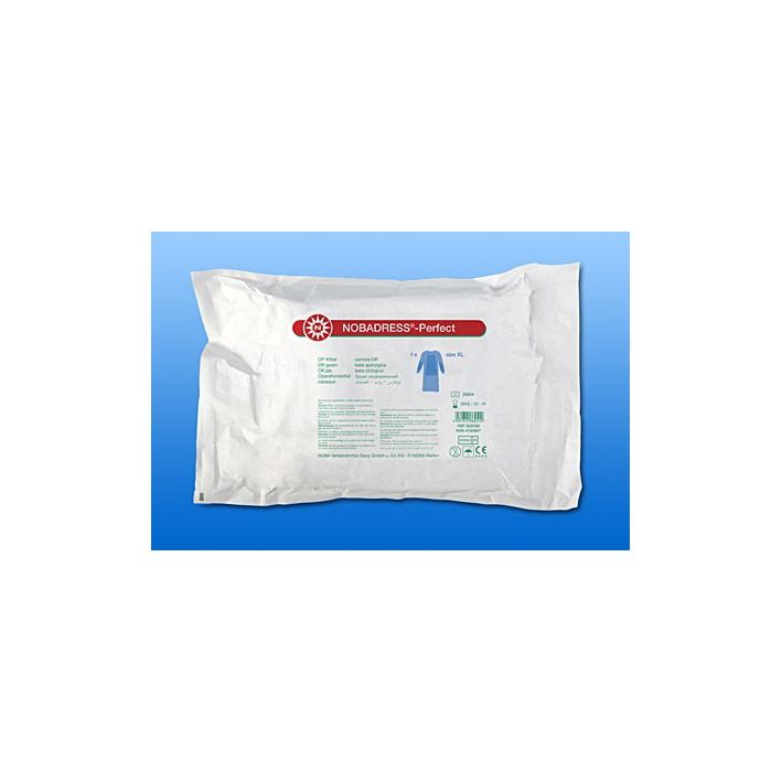 Der Einweg OP-Kittel ist einzeln steril verpackt. Der blaue OP-Kittel besteht aus einem partikelarmen SMS-Vliesstoff.