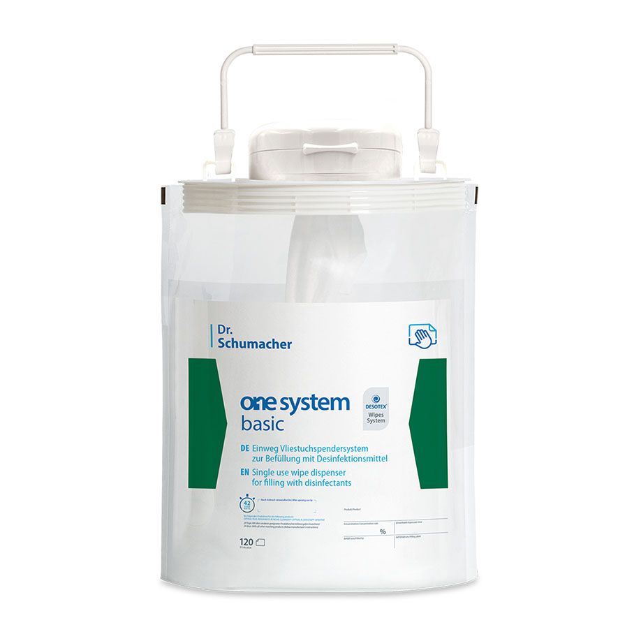 ONE SYSTEM BASIC ist ein innovatives Einweg-Vliestuchspendersystem (Tuchgrösse: 17,5 x 36 cm) zur Durchführung von Hygienemaßnahmen. In Kombination mit geeigneten Desinfektionsmitteln können medizinisches Inventar sowie Flächen aller Art hygienisch sicher aufbereitet werden. ONE SYSTEM BASIC ermöglicht eine praxisnahe und zeitsparende Anwendung. Das System ist bereits mit einer DESOTEX Vliestuchrolle ausgestattet, sodass der Anwender direkt nach Befüllen mit dem Desinfektionsmittel und einer 15-minütigen Vortränkzeit die gewünschte Desinfektionsmaßnahme durchführen kann. Im Einsatz von OPTISAL® PLUS, BIGUANID FLÄCHE NR, OPTISAL N, CLEANISEPT®, DESCOSEPT SENSITIVE kann ONE SYSTEM BASIC anstatt der marktüblichen 28 Tage über einen Zeitraum von 42 Tagen verwendet werden. Ist die Vliestuchrolle aufgebraucht, wird das System nicht aufbereitet, sondern kann restentleert, direkt entsorgt werden.