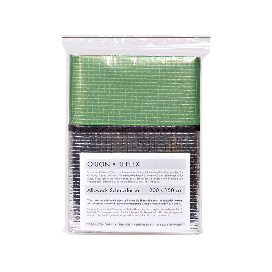 Sehr strapazierfähige Allzweck-Schutzdecke, pflegeleicht, desinfizierbar, für den Dauergebrauch geeignet. Dreifach-Verbundmaterial aus aluminiumbedampfter Polyesterfolie mit Polyestergittergewebe und PE-Folie. Kanten eingefasst, Ecken
