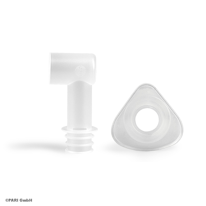 Die Maske enthält Ausatemlöcher, somit muss der enthaltene BABY Winkel (mit Ausatemschlitzen) nicht mehr zwingend verwendet werden. Der BABY Winkel ist weiterhin enthalten für die Inhalation im Liegen z. B. bei Babys, die noch nicht sitzen können.