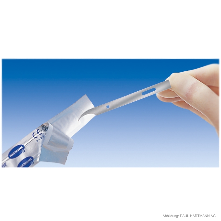 aus gehärtetem Qualitätsstahl, mit rundgeformter, exakt geschliffener Klinge und handlichem, 6,5 cm langem Schaft, einzeln in stabiler und sicherer Aluminiumfolie eingesiegelt.