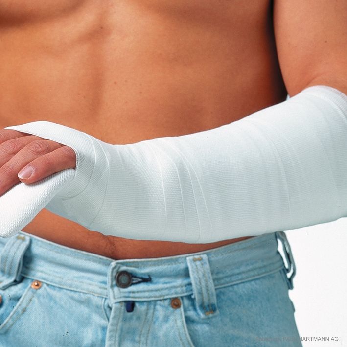 Hochelastische Fixierbinden (58 % Polyamid, 42 % Viskose), Kettfäden aus gekräuseltem Polyamid und Schussfäden aus hautfreundlichen hydrophilen Fasern, Dehnbarkeit ca. 140 %, ohne Umschlagtouren schnell und einfach anzulegen, zuverlässiger und rutschfester Sitz, sterilisierbar (Dampf A 134 °C).